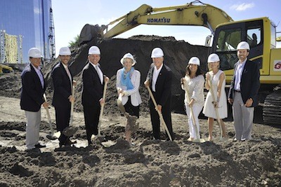 Photo Courtesy Michael Saunders and Company: Team responsible for the construction and sales of VUE Sarasota Bay and The Westin Sarasota turn a ceremonial shovel of dirt at yesterday’s groundbreaking for the pair of bayfront structures. L. to R., Bob Vail, James Hanson, Ed Jahn, Michael Saunders, Georgia Kopelousous, Lisa Morris and David Arent.