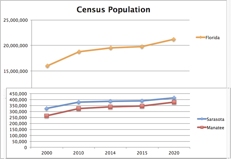 U.S. Census projections show that since the start of the 21st century, Sarasota County's population has continued to grow, but at a slower rate than the state of Florida as a whole. Manatee County, meanwhile, has grown at a faster rate, even though projections through 2020 still show Sarasota wiil continue to have the larger population.