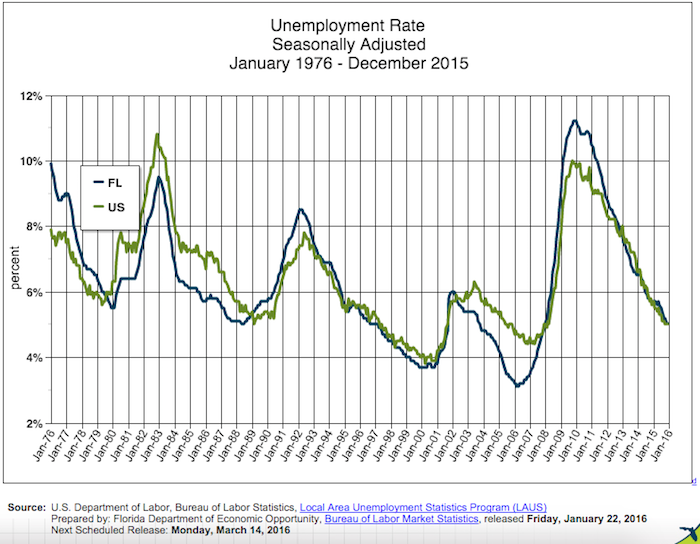 The unemployment rate in the state of Florida for December was 5.0 percent, slightly lower than the 5.1 percent unemployment reported in November, according to the state Department of Economic Opportunity. State officials note that the state unemployment rate has been at or below the national unemployment rate for 23 of the last 37 months, though the two figures have been more closely aligned in the last two years than in the early stages of the economic recovery. In December, the national unemployment rate was also 5.0 percent.