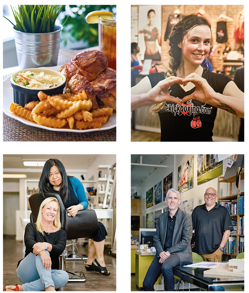 Below, clockwise from top left: Smoked chicken plate from Uptown Eatery, iLoveKickboxing in the heart of the Rosemary, Architects Michael Halflants and John Pichette in their Rosemary offices and Miho
