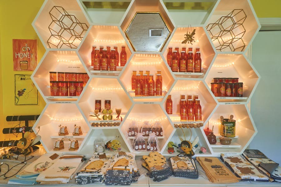The Manasota Blend combinines honeys from hives all over Sarasota and Manatee Counties for one bombastic explosion of nectar. “While purchasing honey raw over pasteurized is great, hyper-local raw is even better,” explains Johnson of harvesting pollen specific to the area as a cure-all for seasonal allergies and illnesses. “We made this because customers who live in Sarasota, work in Bradenton and go play in Myakka needed an allergy blend,” she says. “Customers love it and swear by it.” Sarasota Honey is also proud to offer the purchase of hive kits to start your own apiary farm. If you were really born to bee wild, peruse the bounty of handcrafted goods brimming a shelved wall, appearing as a magnified honeycomb. Sarasota Honey goes above and beeyond, creating a whole range of products celebrating the sassy insect. From tea towels, potholders, oven mitts and aprons, decorate your kitchen with charming “Bee Happy” prints. Find locally made jewelry, beard salves, bug repellent, a pet line with paw/nose ointment for your Frenchie and even waterproof, reusable beeswax saran wrap.