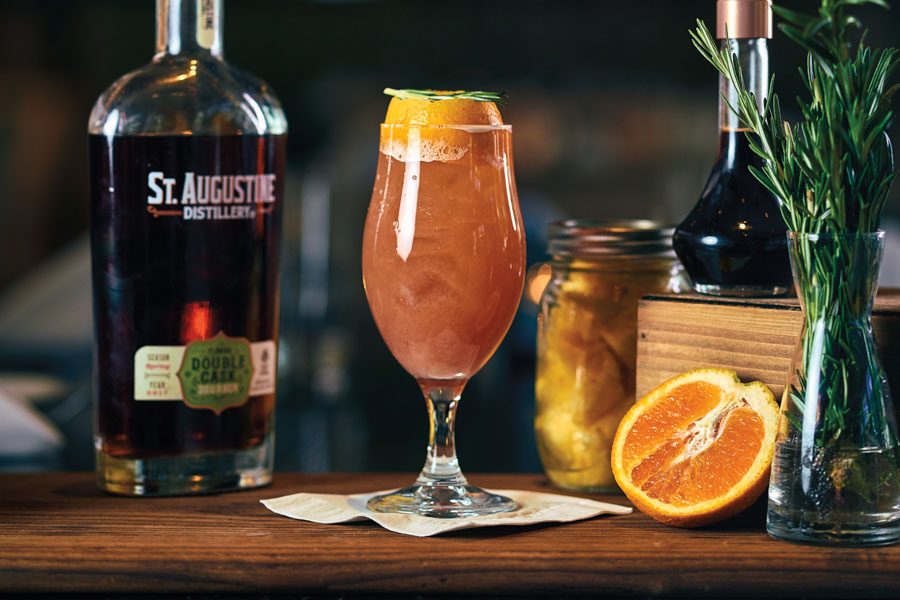 St. Augustine Distillery Double Cask Bourbon plays the base of the cocktail—paying homage to Florida’s most historical and cultural city. Ingredients to come include a spoonful of Louies’ house-made grapefruit marmalade, plus a dash of their proprietary bitters, which carries notes of cinnamon sticks, cloves and nutmeg. Viohl adds a few splashes of fresh pineapple juice (since SRQ Media’s home base resides on Pineapple Avenue), then masters shakeology by robustly shaking the elements and straining them over ice into a chilled, tall martini glass. But the party’s not over—we decided to top the ‘tail off with a floater of Big Top’s Circus City IPA, for a shout-out to our local brewery crafting some of the finest hops on the coast. Florida’s favorite citrus rims the glass with the zest of orange peel, and in honor of Sarasota’s up and coming neighborhood, the finishing touch is a flaming rosemary sprig (stand a few feet back—the pyromaniac bartenders have some fun with their fire). The tropical fruit flavors mix immensely well with the crisp bourbon and the refreshing finish of IPA. The secret’s out—your new favorite fall drink just leaked (figuratively and not literally, we hope). Cheers!