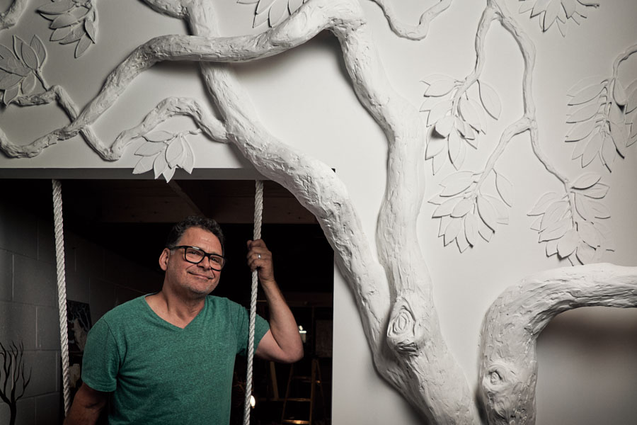 “I found out I can draw,” Hostetler says, and his eyes still gleam like a Goonie finding buried treasure. “The energy and artistic spirit consumed me and I couldn’t stop.” Specifically, he couldn’t stop drawing trees, their sprawling limbs stretching across his page, seeking and searching. “The trees represent our own lives,” he says. “Struggles, divorce and death, yet you still grow.” And Hostetler had some growing to do yet. “Drywall’s not a medium,” he remembers saying to his Ringling coworkers when they suggested he try his hand with the material he knew so well. They shrugged and showed him a video of a man sculpting underwater scenes from drywall mud. “Everything is a medium,” Hostetler says now, and if that guy on YouTube can make fish, then he can make trees. He cleared out space in a supply closet on the third floor of a Ringling dormitory and began sculpting on the walls in secret. He eventually left that job, but one of his trees remains.