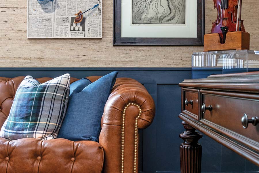 Many of the exquisite living pieces were sourced locally through the International Design Source, including a custom chestnut leather tufted sofa, with brass nailhead trim that pulls out into a bed for guests and remains the aligning focal point. Another standout element in the space is the grasscloth wallpaper, adding a layer of texture and warmth. Averting from standard home office designs, “I wanted to create a room that captures your attention and draws you in,” says Bishop, piquing your intellectual hunger and leaving your external stressors at the door.