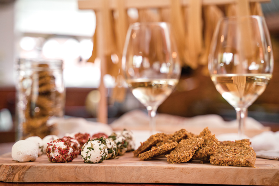 Homemade crackers—baked soft, chewy and gluten-free with whole wheat flour, almond meal, pumpkin seeds, sunflower seeds, onion, walnuts and tomato—served with three different types of macadamia nut “cheese”, rolled in herbs or crushed black pepper.