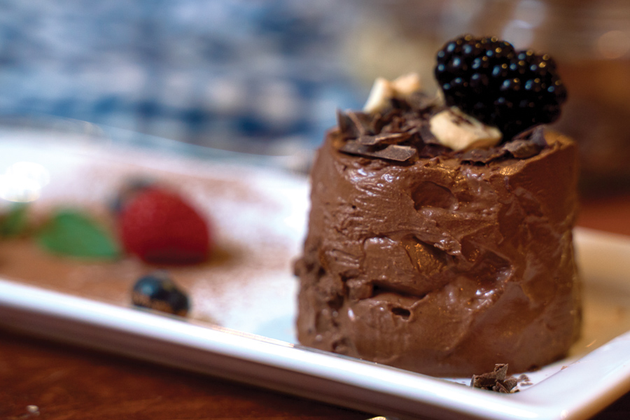 Chocolate Tart—Silken tofu, raw cacao, vanilla and maple syrup blended together, molded and chilled—garnished with cocoa powder, fresh berries, dark chocolate shavings, cashews, rice whip cream and fresh mint.