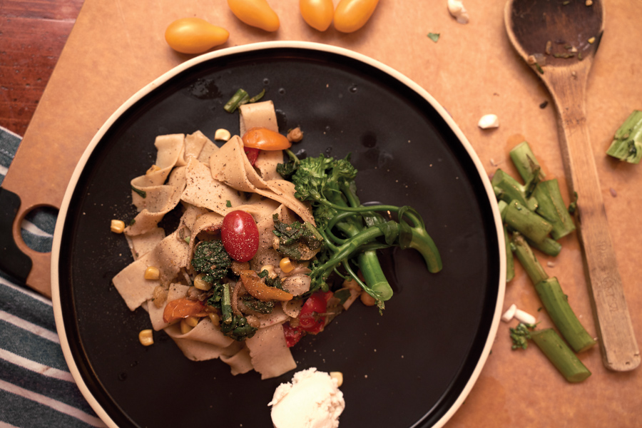 Veggie Pasta—homemade, organic Kamut pasta sautéed with enoki mushrooms, cherry tomatoes, spinach, kale, corn, broccolini, roasted chickpeas—finished with fresh rosemary and basil sprigs from the backyard garden.