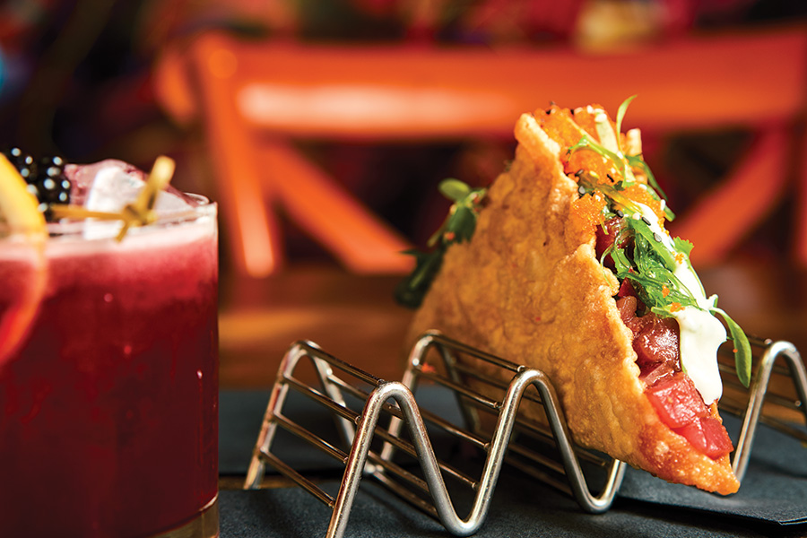 The menu assembled by Executive Chef Francisco Alvarez hosts an Epcot of around-the-world artisanal tacos from the Thai Shrimp, tempura flash-fried shrimp with Napa slaw, mango salsa, pickled peppers, cilantro, honey-sambal aioli and tempura scallion threats, to The Cubano, filled with mojo pork, lettuce, cheddar cheese, house pickles, pickled peppers and a honey mustard dijonnaise. The Korean Pork reps some kimchee slaw, pickled fresno’s and an “angry” crema, while the Mongolian Beef fills the tortilla with shredded beef, hoisin BBQ, sambal sesame slaw, scallion threads, cilantro and toasted sesame seeds. A Hawaiian-inspired Ahi Poke taco trades the flour tortilla for a crispy wonton shell and packs in fresh raw tuna, cucumber, wakame, masago, wasabi crema, inamona jus and sesame seeds, while a Middle Eastern–inspired Edamame Falafel hosts tzatziki, arugula, tomato, avocado slices, pickled peppers, onion and cotija cheese. And whether you think the British have good food or not, the Fish & Chips taco does the trick, with beer-battered tempura cod, malt-curry mayo, Napa slaw, pea tendrils and french fry crisps.