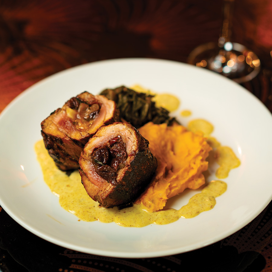 That pep seems to have been designed specifically to pair with the Louisiana Lemonade, a Blasé signature cocktail of Tito’s Handmade Vodka, St-Germain, Cointreau, lemon and prosecco. The two form an altogether delightful and confounding pair, evoking both a tailgate party and an afternoon on the veranda sipping cocktails in linen clothes. A pork loin stuffed with dried cherries and caramelized onions comes glazed with bourbon—which will make one more appearance for dessert—with a side of mashed sweet potatoes and collard greens. Tender, rich and savory with a hint of bitter notes, the collard greens, like fried brussels sprouts before them, are poised to change what people think about greens.