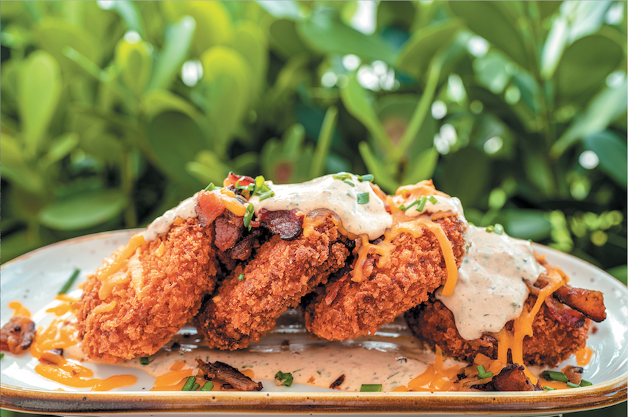 Appetizers are eclectic but deliciously accessible. The coastal calamari comes tossed in the restaurant’s scratch-made ginger sesame sauce and has all the snackability of a potato chip, which means the mound they come served in is best shared with two or more—lest the sweet sauce inspire a diner to eat themselves into guilt. A chef’s-choice charcuterie board also makes for a great first course and conversation starter on account of the glowing, dripping honeycomb, but the potato cakes will assuredly ruin one’s dinner. Stuffed with creamy mashed potatoes inside a crispy exterior, these bacon-topped treats pack all the savory punch of a bacon and sour cream potato skin but go down much more decadently.