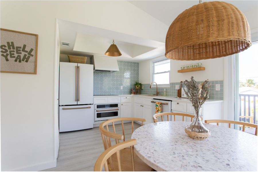 Categorized into color tones—Terra-cotta; Sage; Blush; and Sun Room—each unit fleshes out shades of intentional design choices to embody its designated color theme. “I thought it would be fun to have themed rooms but in an updated, fresh way,” Ashley says. “Get people excited about booking a certain colored room, but then also just as excited to try another one on their next stay. So I decided to make each of the four units its own color to highlight the sunsets and shells that fill the beaches here and build off of one of my favorite linen bedding brands.” The darling duvets in the bedroom set the tone in each of the units, while the painted shower tiles in the bathrooms and the backsplashes in the kitchens perfectly match the respective colorscape of each hue-centric haven.