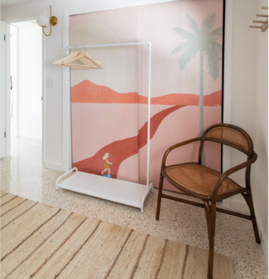 With renovation help from Coastline Contractors, as well as a little handy work and personal touches from family members—including hand-painted rainbow murals and sun stencil designs to the exterior—Joie Inn flipped from an outdated, fixer-upper to a color-happy, boho bungalow that feels like a blend between a boutique hotel and homey Airbnb. Local photographer Arielle Vey (@ariellevey) captured images of AMI for Ashley to incorporate as art on the Frame TV which doubles as a high-quality picture frame.