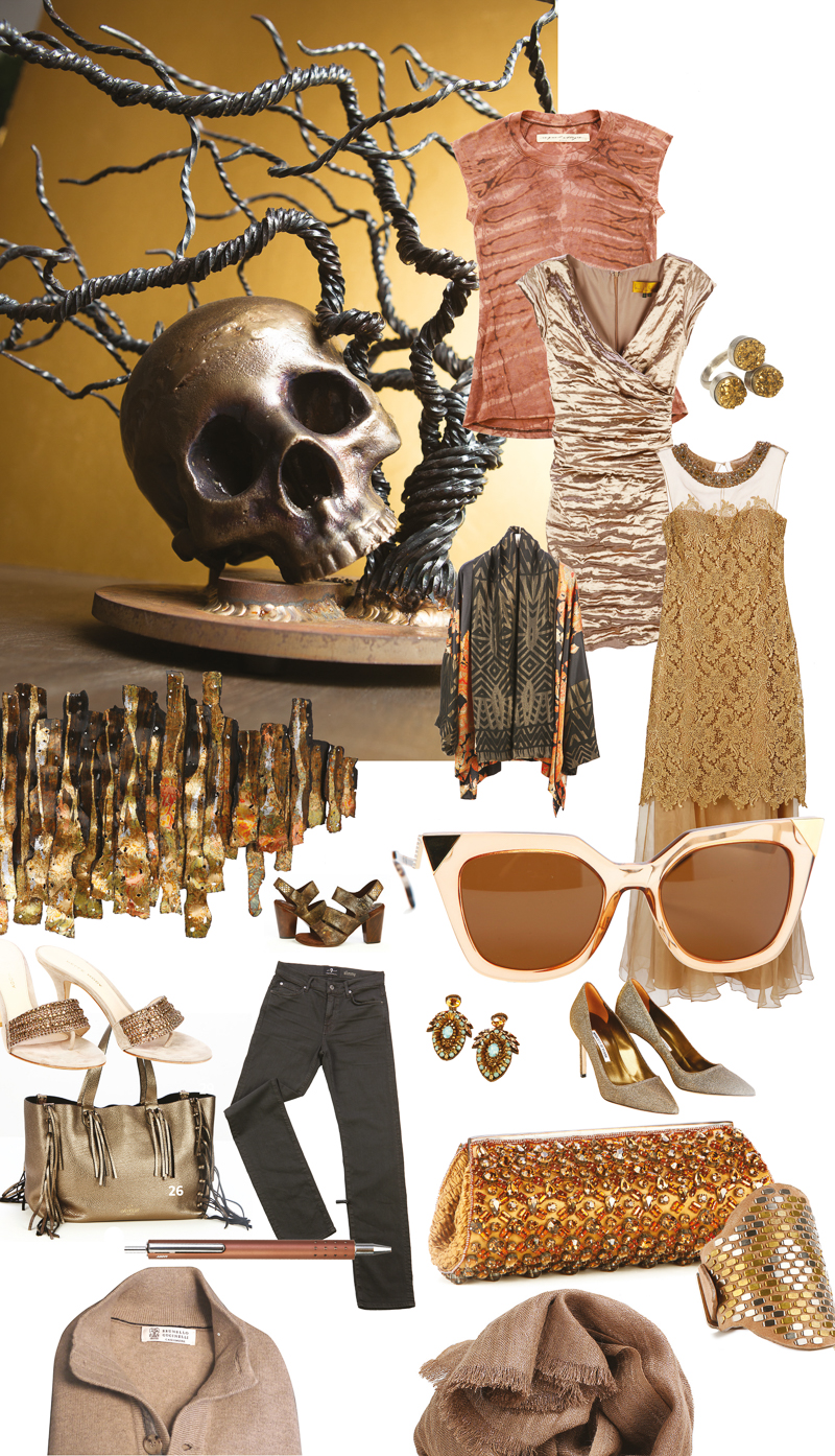 Black Bird Home Gallery: 10. Brass and steel skull for Blackbird, designed by Joel Illch. Whimsical branches extend outward from a dark, bronze skull, bringing an eerie presence to any space. $1,500. 1540 Main Street, Sarasota, 941-366-0941. Chasen Reed: 11. Metal strips with a dripped metallic shine reflect dark bronze and copper tones. Hanging art, $1,000. 1425 1st Street, Sarasota, 941-363-7975.Lotus: 12. Raquel Allegra raglan fitted tee, hand cut and intricately dyed with shades of bronze. $168. 13. Calleen Cordero Sazi heel, hand-crafted in Los Angeles. $510.14.Calleen Cordero Designs topaz bracelet, embellished with nickel and brass hardware. $160. 15.Raw bronze glimmers in a triad ring by Chan Luu. $220. 1451 Main Street, Sarasota, 941-906-7080.L.Boutique: 16. The deep brown silk of this Moyna Couture clutch is burnished with large rust stones and bronze gems. $568. 17. Brightened with turquoise, the champagne glow of these jeweled earrings is framed by brassy leaves and bronze chain. $198. 556 S Pineapple Ave, Sarasota, 941-906-1350.Write-On: 18.Lamy matte bronze pen, $65. 1423 1st St, Sarasota, 941-953-2800. L.Boutique: 19.Organza gown with rich bronze lace overlay, featuring a champagne jewel neckline with woven brass beads. Teri Jon by Rickie Freeman, $878.Foxy Lady: 20. Moyna clutch, $368.00 Pelle Moda metallic suede sandal with brassy gems, $178. Foxy Lady. 21.Pelle Moda evening sandal in taupe suede with layers of bronze stones, $164. 22. Nicole Miller ash bronze cocktail dress with ruching throughout, $432. 481 John Ringling Blvd, Sarasota, 941-388-5239Saks Fifth Avenue: 23. Brunello Cucinelli cashmere sweater, $945.24. Brunello Cucinelli scarf, $1925.25. Fendi cat’s-eye sunglasses, $455. 26.Valentino fringe bag, $3095.27. Manolo Blahnik bronze heel, $695. 28. Etro printed wool and metallic silk scarf jacket, $1595. 29. Etro metallic printed pant, $495. 120 University Town Center, Sarasota, 941-364-5300.