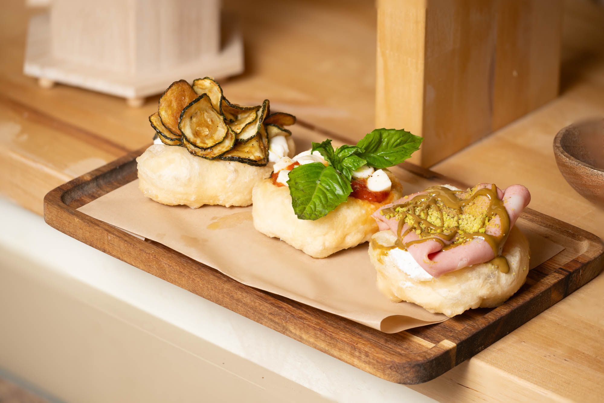 At Bella Napoli, however, all things eventually come back to the oven. The tris montanare, or small fried pizzas, are three airy pillows of dough, each with a different assortment of toppings. One features crispy, lightly fried zucchini chips atop a bed of zucchini pesto and stracciatella cheese—the same creamy filling found in burrata. Another is a classic—bright floral tomato sauce from San Marzano tomatoes, mozzarella and sprigs of fresh basil make the montanare sing. The third, however, is the real star of the trio. The montanare is slathered in a rich, decadent pistachio cream before piling on ricotta cheese, paper-thin mortadella and a dusting of pistachios for the perfect blend of sweet and savory.
