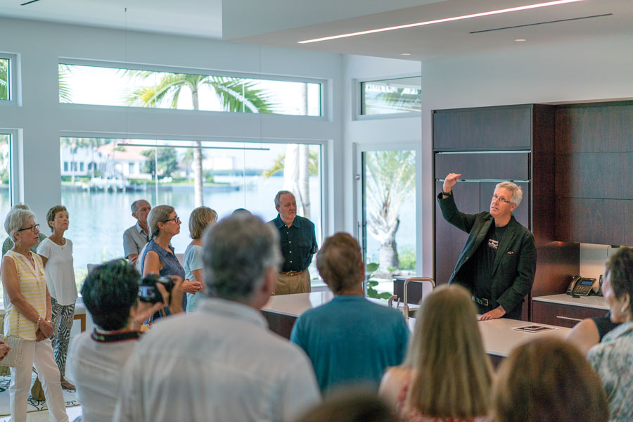 It’s a warm and sunny Friday morning in Sarasota and the usually sleepy street on Bird Key bustles with activity, parked cars lining the road as men and women from across the region descend upon one house in particular—a newly remodeled home designed by architect Guy Peterson and built by Sarasota contractor Michael K. Walker. Marching up the driveway—its paved blocks poured in alternating stripes with encroaching green spaces—chatter subsides as they approach the entrance, slits in the concrete walls giving only a partial view of the home hidden behind, and through a winding outdoor passage lined with lush greenery, runnels of smooth grey stones and a living wall installation of arranged tillandsia air plants, courtesy of landscape architect David Young. At the shaded door, a secret sculpture nook hints at more inside—a substantial collection of modern art rivaled only by the artistry of Peterson and Young’s design. “We don’t like to give everything away right away,” says Peterson with a smile. “The progression as you enter is part of the experience.” And when the door opens, the show begins. The opening salvo of the Center for Architecture Sarasota’s (CFAS) 2017 Modern Show celebrating art in architecture, the featured home tour on Bird Key represents only the first stop on a two-day excursion into the world of modern architecture that saw everything from guest lecturers and interactive opportunities to a bona fide rock show/gallery presentation in CFAS headquarters. “The relationship of art and architecture is an important and symbiotic one,” says CFAS Founder Cynthia Peterson. “They complement and influence each other very strongly especially in the context of modern design. CFAS wanted to highlight that relationship and importance.”