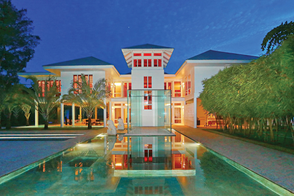 Situated on a barrier island overlooking the Gulf of Mexico, this landscape is a dazzling mix of geometric form, carefully manicured lawns and the shaggy manes of numerous bamboo trees. The landscape architects collaborated closely with the owner to create a garden that takes full advantage of the site’s location, views and climate. The site’s sequence of designed spaces carefully balances large but simple geometric shapes with a well calibrated plant palette. Entry to the house is gained via a concrete walkway that passes over a water garden and through a glass cube flanked by marble Foo Dogs. The water garden continues to a glass-enclosed lower-level where a waterwall provides the perfect backdrop for a beachside spa and fire pit. The experience of this exquisite landscape is not limited to the ground; a wooden terrace allows full view of the Gulf and a new spiral glass staircase leads to a crow’s nest overlooking the property.