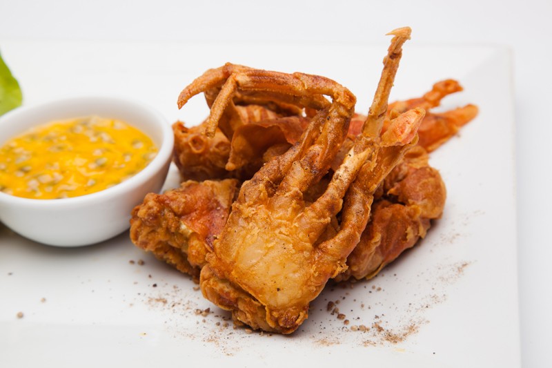 Chef Jamil Piñeda utilizes the currently in-season soft shell crab as the base protein for the sandwich, and he fries it light with buttermilk to give an almost tempura feel to the batter while maintaining softness inside. He couples that with Cuban bread baked crispy on the exterior but moist inside. The po’boy is layered with shredded letteuce, pickled onions and okra and chef’s remoulade. He starts the sauce with his homemade mayo mixed from olive oil, eggs and garlic and pairs it with more eggs, ketchup, caramelized onions for a touch of sweet flavor and his mix of spices that include paprika, cumin, nutmeg, oregano and a few extra Creole staples. I can’t help but ask for a side dish of the stuff for extra dipping. Piñeda finishes off the plate with a pile of micro pomme frites (fries) to send you on your way happy.