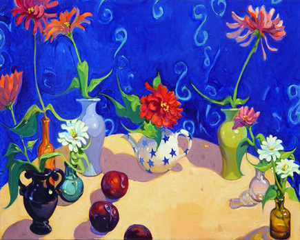 Pamela duLong Williams, "Zinnias on Blue," Oil on canvas, 24" x 36", Dabbert Gallery 76 S. Palm Ave., Sarasota, 941-955-1315
