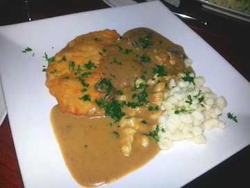 First timers should order the schnitzel, a veal, pork or chicken cutlet, pounded thin, breaded, sauteed and served with your choice of four different sauces: Zigeuner, a gypsy style red sauce, Jäger, a mushroom cream sauce with fresh parsley, Zwiebeln, sautéed onions, Kräuterbutter, herb butter, or Holstein, which is topped with egg sunny side up.