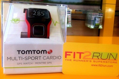 Fit2Run carries the all-new TomTom Multi-Sport Cardio GPS watch, featuring a built-in heart rate monitor, allowing you to ditch the uncomfortable chest strap for real-time monitoring. The sleek red and black arm-candy will keep you on pace for any race so you can keep calm and TomTom on.