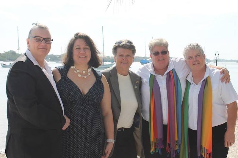 Pictured: Cindy Barnes, center, performed a joint ceremony for the first same-sex couples wed in Sarasota County: Susan Pringle and Barbara Sharpe, left, and Gail Foreman and Pat Cummins, right. Photo by Jamie Arena, courtesy Sarasota Pride.