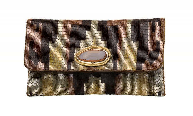 Influenced by the vibrant spirit of ventures from her around the globe, handbag designer Mary Frances and her whimsical designs have been showing up on the arms of fashionistas and celebrities such as Kate Hudson and Jennifer Aniston. Foxy Lady on St. Armands Circle has been featuring her collection, which includes this envelope clutch made out of shiny stripes, sequins and Brazilian agate stone. Declared the protection stone, the Brazilian agate is believed to protect from stress, and provide a source of inner strength. The brown, black and gold glass and crystal detail is hand-laid and this clutch also has a super soft structure with an included cross-body chain strap.