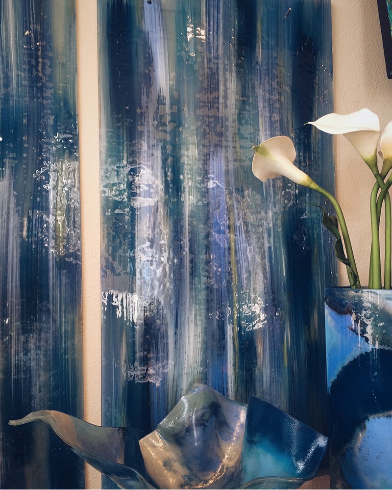 Blue is the hue this summer. Embrace the cool color in its most vibrant form in these striking glass pieces that can be found at Stylish Living by Chasen Reed, including a glass bowl that can be an exquisite oasis for keys, jewelry or other decorative elements, a vase that will hold a lovely arrangement of your favorite blooms all while vying for all of the attention itself, and a glass painting for a waterfall-like effect for your wall.