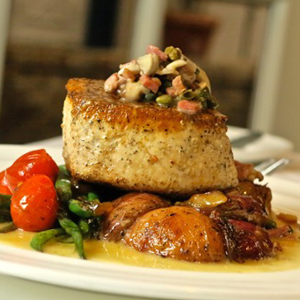 On a large round plate, place potatoes in a half circle. Place the haricot verts next to the potatoes and the swordfish filets in the circle on top of the vegetables. Top with the beurre blanc sauce. Serves four.