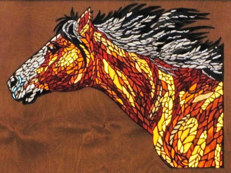 “No light came through it. It could reflect off of it, but it didn’t flow through,” said Morse, “and the functional property of stained glass is to allow light to pass through.” Her solution – scrap the terra cotta and bond her stained glass slivers directly to another pane of glass, providing stability but allowing light to pass freely. Still unsatisfied, Morse found the final component for what would become her patented style through a hunch. “I could see wood as a natural balance to the texture of the glass,” said Morse. “It blends absolutely beautifully together.”