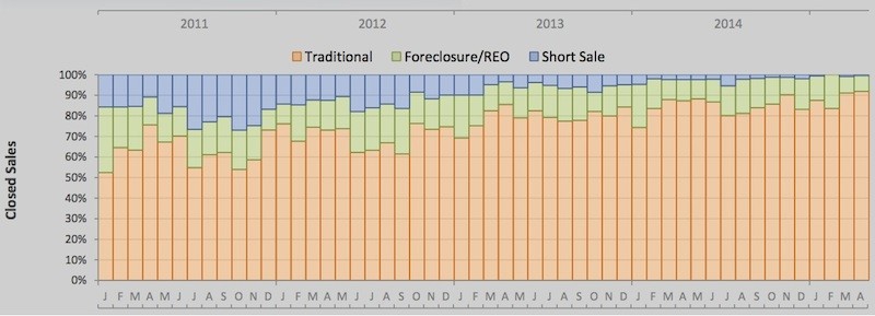 Traditional sales of condominium and townhouse units, as opposed to short sales and foreclosures, in Manatee County made up a higher percentage of sales in April than any other other month over the past four years, according to statistics released by the Realtor Association of Sarasota and Manatee. There were 252 traditional sales closed in April, compared to 214 the same month last year, while there were just 21 foreclosures and one short sale, compared to 25 foreclosures and six short sales in April 2014.