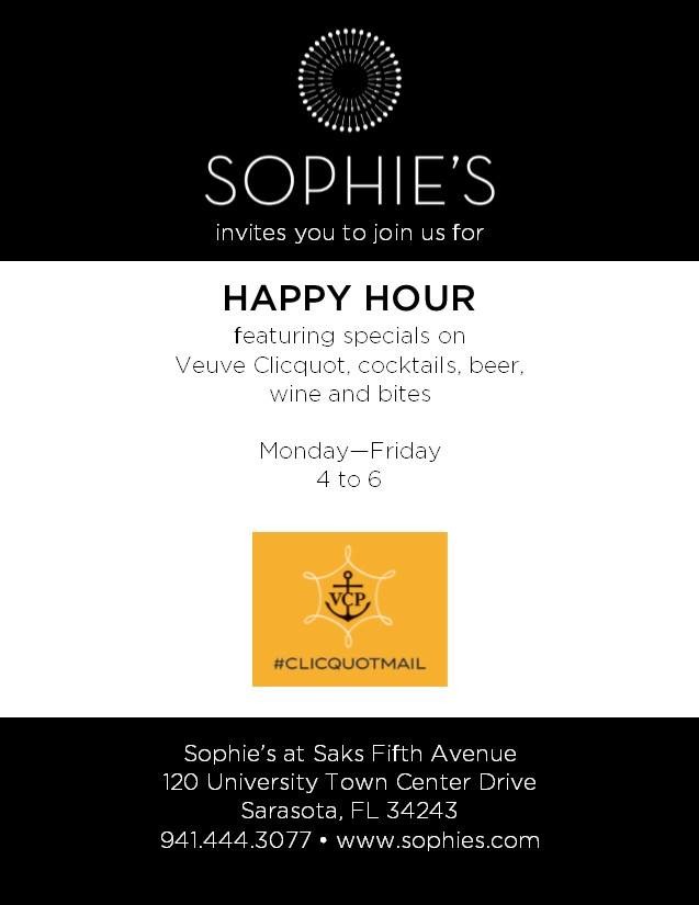 Sophie’s, the signature restaurant located on the second floor of Saks has launched a happy hour menu for the summer, complete with a partnership with Veuve Clicquot. Sophie’s is the ultimate dining and cocktail destination, blending elegance and style seamlessly with seasonal American cuisine. Sophie’s new happy hour menu features glass and bottle specials on Veuve Clicquot Brut Yellow Label and Veuve Clicquot Rosé. Other drink specials include $4 beers, $6 wines, and $7 cocktails. Chef Dianna MacPhee has also created a fun menu perfect for a happy hour bite, including Crab Samosas, Plum Glazed Chicken Bites, and PEI Oysters on the Half Shell. Sophie’s Happy Hour menu is available Monday-Friday from 4-6pm. Sit down at Sophie’s for a refreshing end to your day.