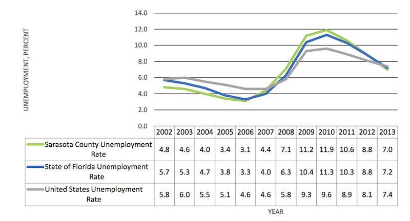 This data shows a comparison of the unemployment rates of the United States, Florida and Sarasota County. The unemployment rates followed a relatively similar pattern on the county, state and national level. The three levels saw a steep increase in rates from 2007 to 2010, which aligns with the 2007 financial crisis timeline. In 2010, the unemployment rates began to decrease again, but had yet to reach the rates they were at before the increase in 2007.
