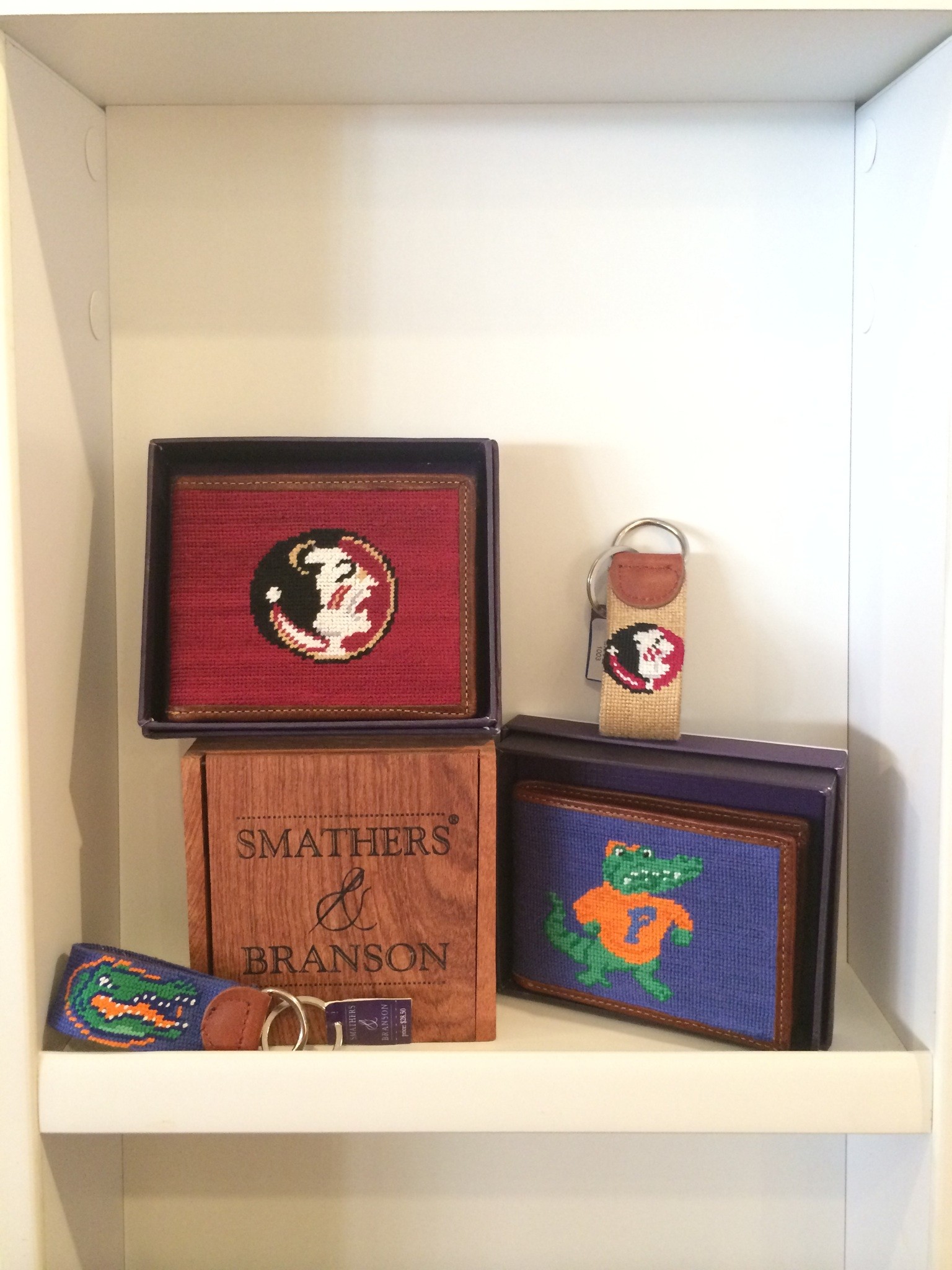 The back-to-school season is upon us and college students are beginning to pack. Perfect for a going away gift, these hand-made wallets and keychains are available in a wide selection of schools. Fugates on Main Street carries the Smathers and Branson needlepoint accessories, which also include belts and phone cases in matching patterns. For those not going off to school, designs are also available in a range of preppy stitches including fish and American flags.