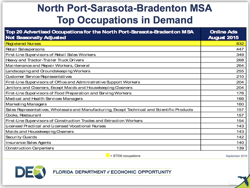 The greatest demand for jobs statewide is for registered nurses, according to the Department of Economic Opportunity, which says throughout Florida there are 16,770 advertised job opportunities in the state. The metropolitan area encompassing Bradenton, Sarasota and North Port has many different job demands than the state as a whole, but like most areas of Florida, the need for nurses is greater than that for any other job.