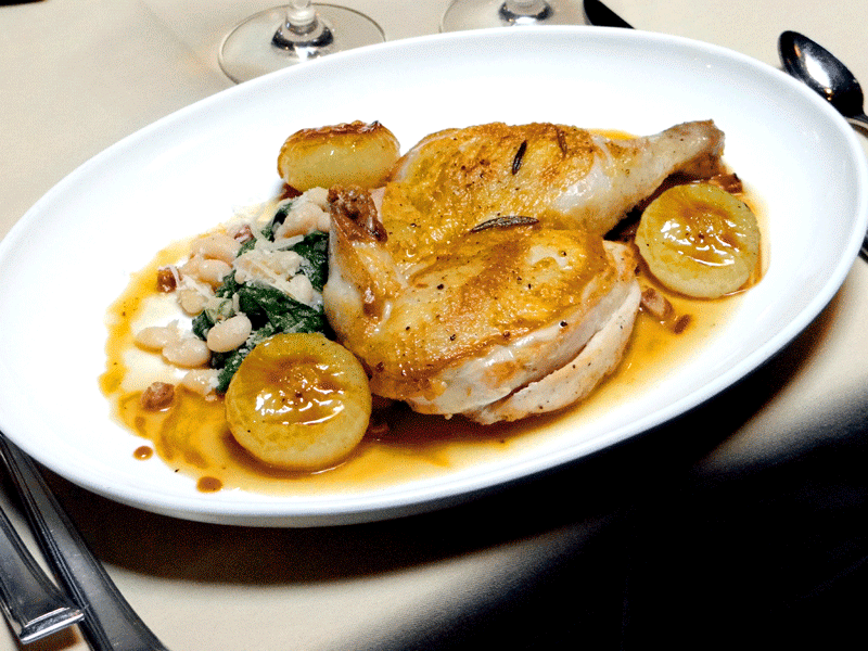 Start the year right with this meal, provided by Chef Paul Mattison out of this cookbook, Chef: The Story and Recipes of Chef Paul Mattison. Make sure you have a brick on hand for this special dish—that name is no euphemism. The dish is shown above served with Greens and Beans and with Caramelized Cipollinis, recipes for which can both be found in the tome.