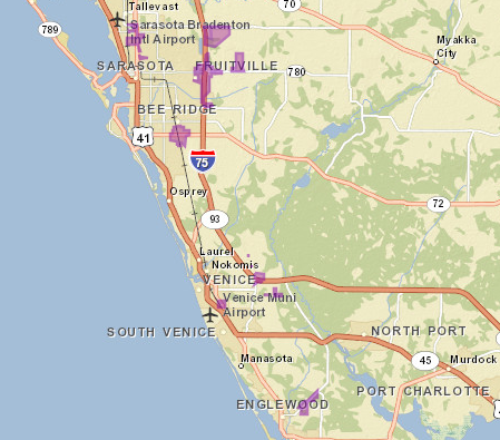 The areas in the purple portions on this map, available from Sarasota County Geographic Information Services, are designated by Sarasota County as employment centers, areas specially designated for private economic development.