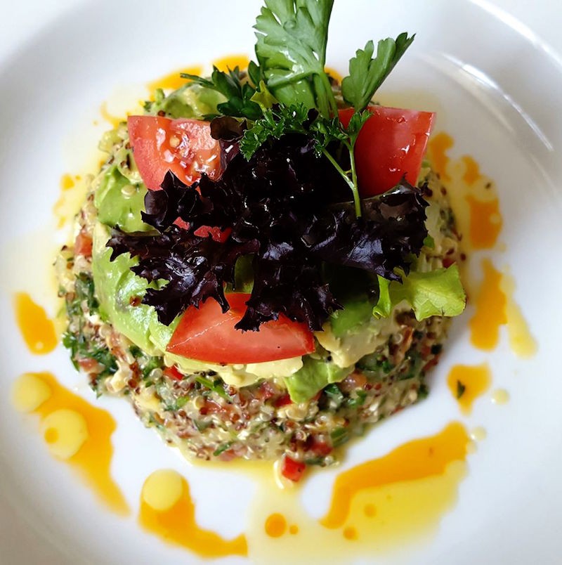 Looking for a lunch spot that’s convenient to downtown and offers a variety of fresh and seasonal options? Look no further than the Hotel Indigo Sarasota’s full service restaurant H2O Bistro. Besides the regular menu, which features salads like the beet and arugula and sandwiches like the Ringling Reuben, there’s a daily special menu of beautifully presented artisan dishes such as the arugula, goat cheese, and prosciutto board with housemade fig chutney or the Indigo Chopped Salad (pictured) with red and white quinoa, feta cheese, Roma tomatoes, red onions, mango, avocado, lemon emulsion, fresh mint and chili oil.