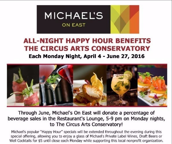 Through June, Michael's o East will donate a percentage of beverage sales in the restaurant lounge from 5-9 on Monday nights to the Circus Arts Conservatory. Michael's Happy Hour specials will be extended thoughout the evening diring this special offering, allowing you to enjoy a glass of Michael's Private Label Wines, draft beers or well cocktails for $5 until close each MOnday while supporting the Circus Arts Conservatory.