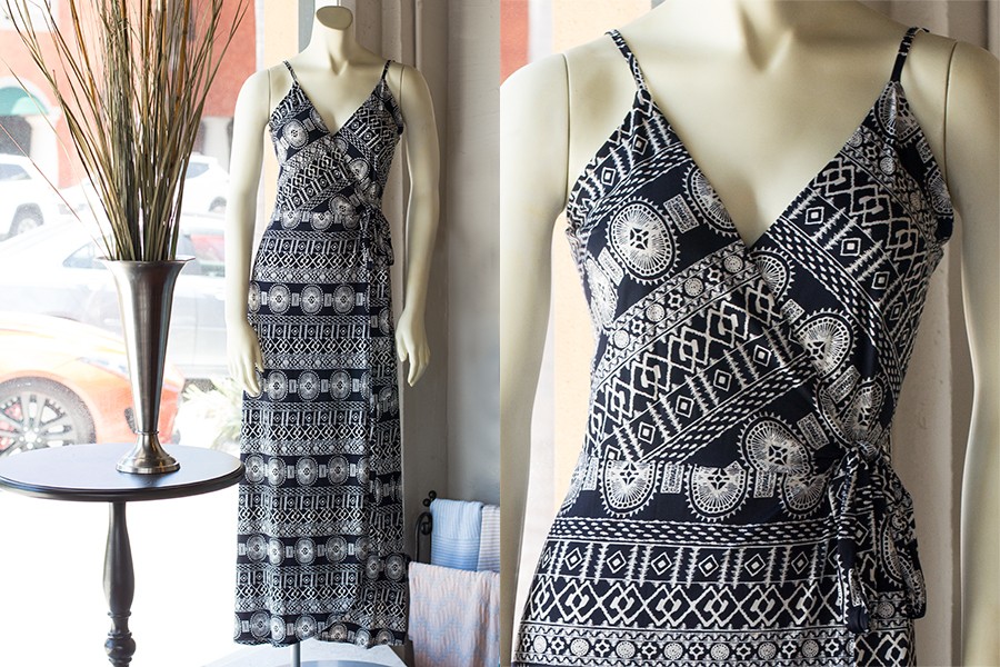 Late afternoon strolls on the Santa Monica Pier and nights out on the Sunset Strip get translated into everyday Sarasota wear with this breezy summer dress by Veronica M. The versatile piece from the LA-based label combines two tried-and-true favorites: maxi and wrap. In the complex navy and white print (known as “mercury”), intricate tribal bands meet starburst medallions. Not only does this feather-light garment transition easily from beach days to downtown nights, it’s also as low-maintenance as they come. Set your shrinking worries aside—the polyspandex blend can be machine washed, dried and rewashed without ever losing an inch. This flowing frock should be a go-to for your next vacation: fold the dress into any size suitcase and it won’t wrinkle and sink wash it in a pinch.