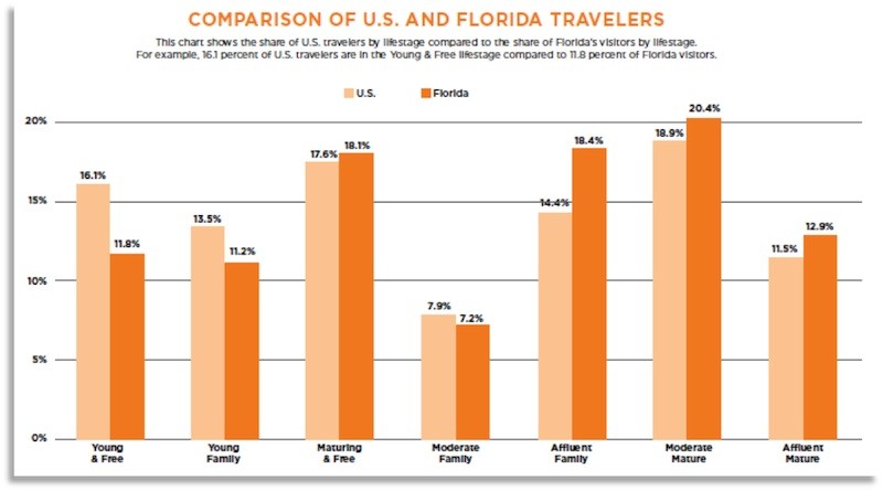 Florida tracks visitor volume, spending and other patterns by lifestage segmentation. The chart, provided by Visit Sarasota, shows the lifestyle segments of US travelers in comparison to Florida travelers. Florida captures a greater share from four lifestages: maturing and free, affluent family, moderate mature and affluent mature. This shows that more visitors for Florida fall within the affluent and maturing lifestages.