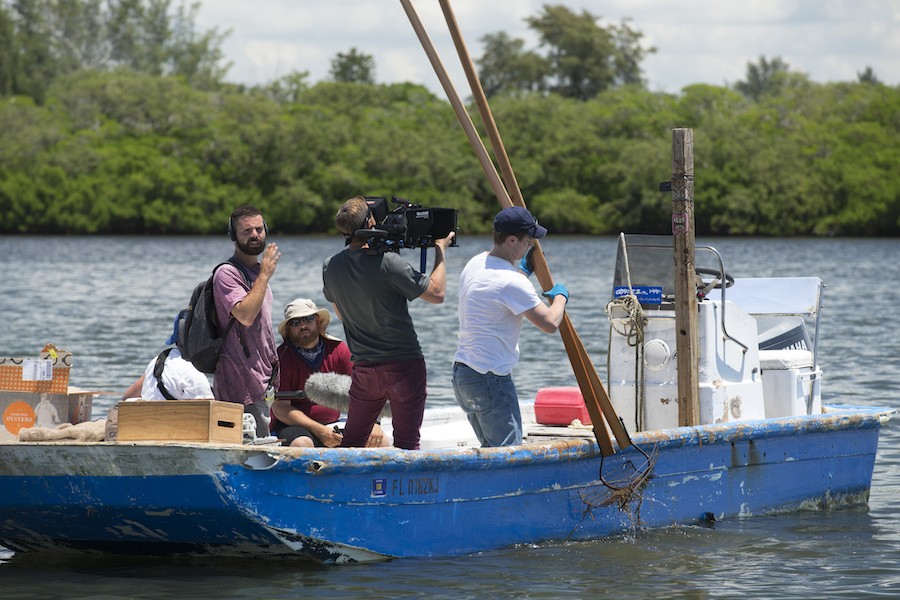 Pictured: Director Nick Morgulis oversees while actor Jon-Michael Miller tongs for oysters. Stephen Reeves operates camera under director of photography Brandon Hyde. Photo by Rod Millington.