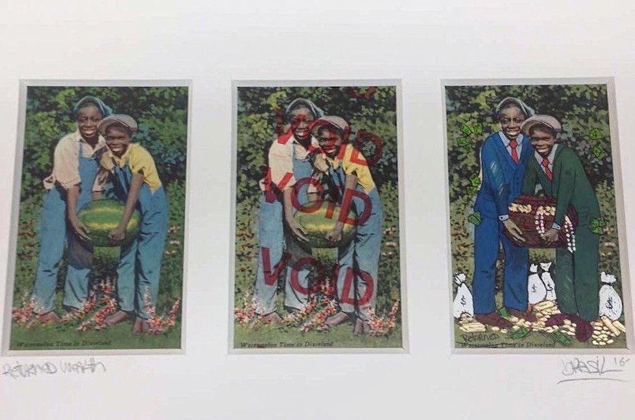 Working in a series of triptychs, Brasil’s ensuing series, Foo’s Gold, reimagines these racist artifacts to capture “how innocent they could have been.” Under Brasil’s brush (or finger), watermelons become bulging treasure chests and cotton bales become river chop and patched clothes become three-piece suits. But the key word is repaint history, not to paint over. Each reimagined image is presented next to the original and a copy with the word VOID red-stamped across. The reality remains and the reimagining is still a lie in its way, says Brasil, and the series is called Foo’s Gold for a reason.