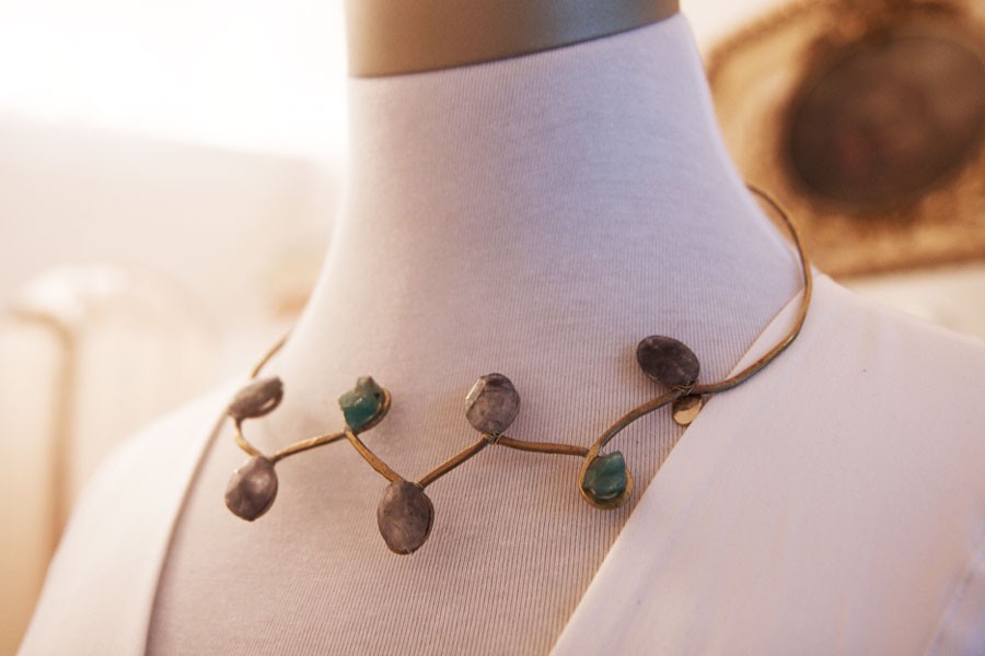 Colombian raw emeralds, smoky quartz, turquoise and agatha stones nestled in gold-hued hammered brass—designer Fadia Bechara partners with an Old World artisan school in Italy to produce her hand-made jewelry. With a conscious mind towards the energetic power of stones and metals alongside crystal therapy, Bechara created her latest Colombian emerald collection with Perrier-green crystals that tap into the heart chakra, protecting you from envy, embracing prosperity and clarifying the mind. A native Colombian living in Italy, the Colombian emerald holds a special place in Bechara's heart, the raw stones presenting with an especially vibrant green and dotted with flecks of gold. Pieces are made with a nod towards naturally occurring phenomena—the nautilus shell formation, the repeating Fibonacci sequence and Phi, the Golden Ratio, bringing balance and harmony into your life. Find Bechara's collection paired with the gossamer gowns within Karen Roth's Pineapple Avenue boutique.
