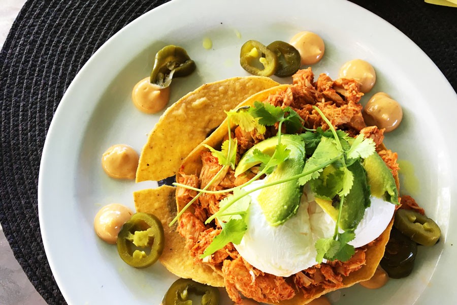 Not quite breakfast, not quite lunch—the Huevos Gringos straddles the precarious line between an eggfull brekkie and a stuffed lunch burrito, and quite possibly could quench a dinner hankerin'. Station 400's deconstructed Mexican mouthful brings together the best of chilaquiles, breakfast burritos and huevos rancheros, creating a masterful mash up not soon forgotten. Two eggs any style (go poached or go home) roost atop sliced avocado and a bed of chopped and pulled chipotle chicken, the creamy orbs just begging for a light poke to set free the golden yolk. Refried black beans provide the base for the two crispy circular tortillas under the chicken, with green slivers of pickled jalapeno peppers and dollops of smoky spicy aioli surrounding the Latin-inspired mountain. Go forth and get messy.