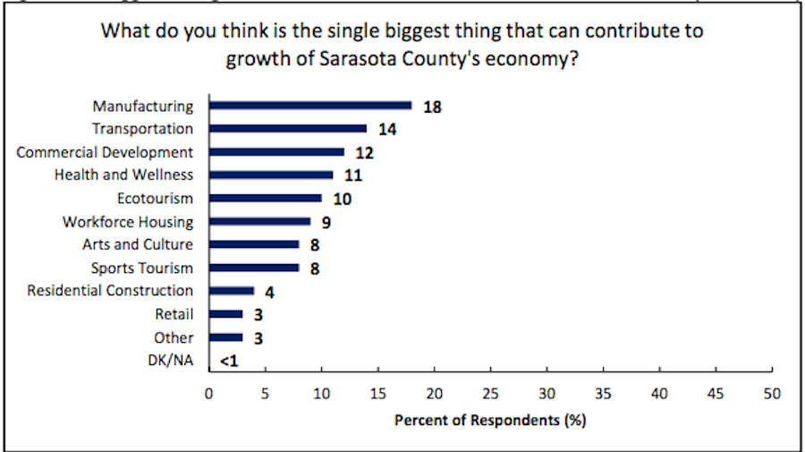 Dr. Susan MacManus has been conducting an annual survey as part of community outreach to get input from citizens about Sarasota County. In 2015, a new question related to the economy was added and is repeated again in the 2016 survey. Citizens were asked what they thought was the single biggest thing that can contribute to the growth of Sarasota County’s economy. Over half (51 percent) of the respondents cited business-related things and 26 percent cited ecotourism.