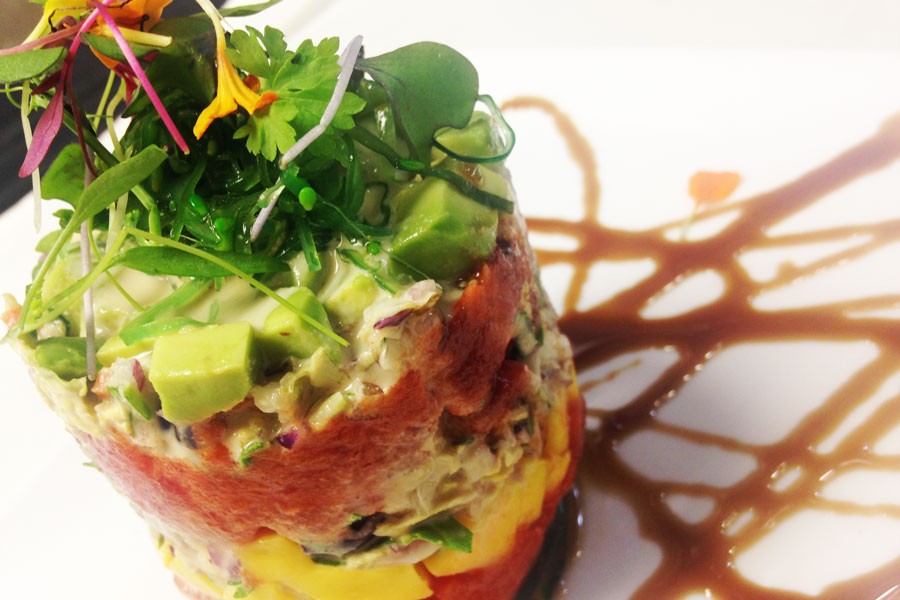 Place round metal mold on square salad plate towards one corner. Mix raw tuna with sriracha hot sauce and set aside. Chop asian slaw, red onion, baby arugula and place in a bowl. Mix with wasabi aioli and set aside. Fill mold in this order from bottom to top: cucumber slices, ½ of the tuna, diced mango, asian slaw, remaining tuna, diced avocado, seaweed salad. Top with remaining wasabi aioli and garnish top with microgreens. Dip a spoon into soy caramel and drizzle sauce in a circle around the mold. Make sure to lightly pack mold as you place ingredients into it so they do not fall apart when you lift the mold off. Remove mold and serve.