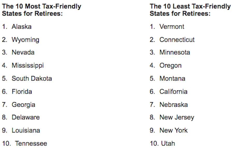 Every year Kiplinger reveals its annual list of the most and least tax-friendly states for retirees. Its 2016 retiree tax map reveals senior tax breaks across all 50 states, and compares taxes on income (including social security benefits, pensions and other forms of retirement income), property, everyday purchases and your estate. As seen above, Alaska placed first for the most tax-friendly and Florida was ranked no. 6 out of 10. Vermont was ranked no. 1 as the least tax-friendly state for retirees.