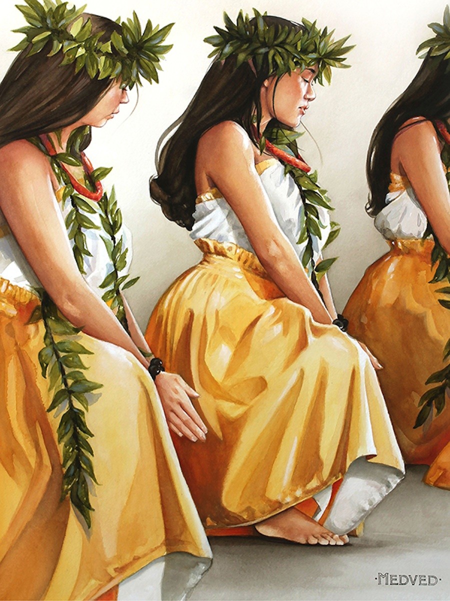 Turning her artist’s eye to the Polynesian culture, Medved finishes the series with six vibrant depictions of hula dancers, world champion Polynesian dancers from Tahiti and the next generation—a small bare-chested child in grass skirts staring defiantly out of the canvas with upturned palms. No matter the subject, Medved renders each with exquisite exactitude, the crisp lines and fine detail capturing the world behind their eyes and lending a weighty presence to every face—no mean feat in the world of watercolor. “You have to have a very special ability to do that,” says artist Tim Jaeger, co-founder of the artists collective SartQ, which claims Medved as a member. “Watercolor is not an easy medium, not forgiving.”