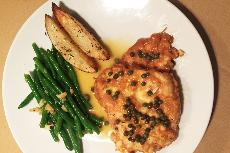Ingredients: 1 chicken breast, 2 eggs; salt; pepper; 1 cup flour; capers; 1 Tbsp. butter; ½ cup white wine; ¼ cup lemon juice; ½ cup oil.