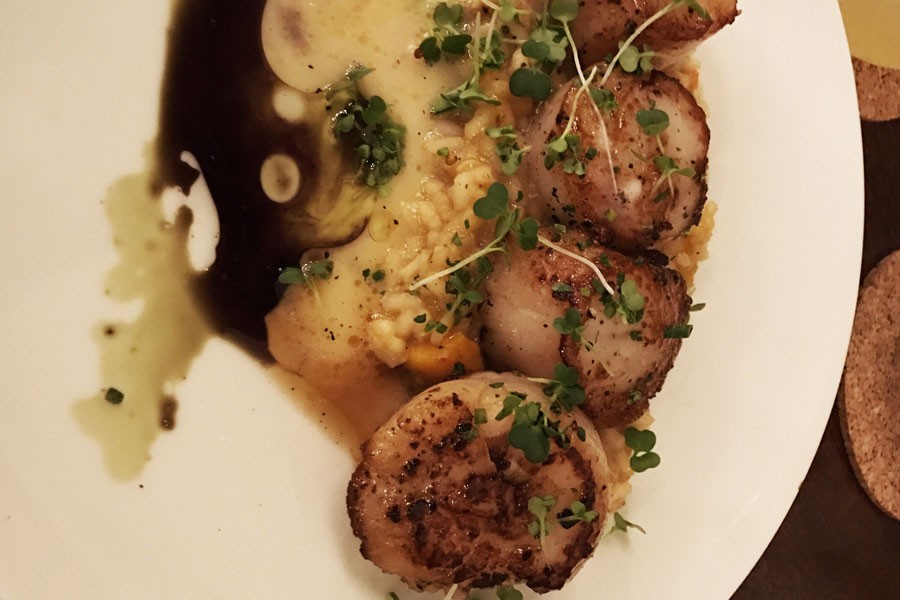Up on the chalk wall at Lila last week, diners took note of the handwritten specials—an ever-rotating roster—the last of which being pan-seared scallops with squash risotto. Thinking it a daring choice to order seafood at a vegetable-driven restaurant—especially a dish that can go so terribly wrong if cooked just slightly too much or too little—it was with immense satisfaction that the first taste was taken, a pleasant surprise amidst a menu of pleasant surprises. Seared to perfection, the meaty white orbs have a golden crunch layered atop a creamy—yes, creamy—and super juicy mid-section. With just enough spice, the four scallops take on a sweetness that pairs well with the earthy, full-flavored fall squash risotto beneath. The plate is perfectly balanced—just filling enough for an entree while leaving ample room for one of Lila's vegan desserts.